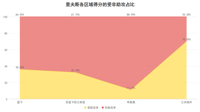 里夫斯显得更加均衡,虽然三分线内的里夫斯同样受助攻率小于非助攻率,但在三秒区内以及三分线外均有更多的受队友助攻得分。简单来说,里夫斯在无球进攻与持球进攻上均可发挥作用,这样一来东契奇持球时他可以化身无球打法发挥自己的作用,当东契奇不持球或遭遇严防时他也可以自主持球创造得分与助攻的机会,双核驱动的湖人就变得更难限制了。