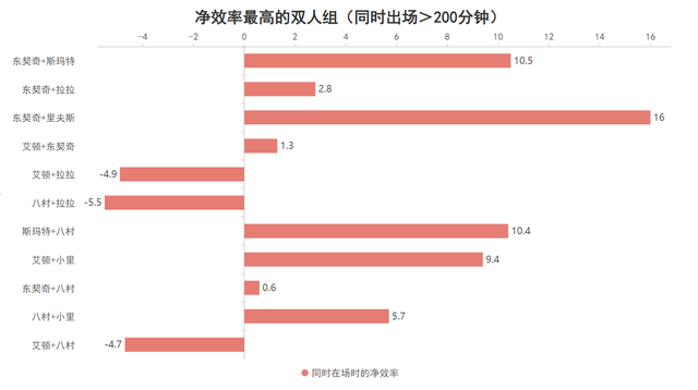当然这对双人组无法达到最顶级的防守,但在结合防守端表现后,两人同时在场的净效率依然达到了16位于11对双人组里的最高,这意味着东契奇与里夫斯同时在场时湖人每百回合的净胜分为16也是双人组里最多的,因此两人在场时的赛场状态就直接决定了湖人的胜负。