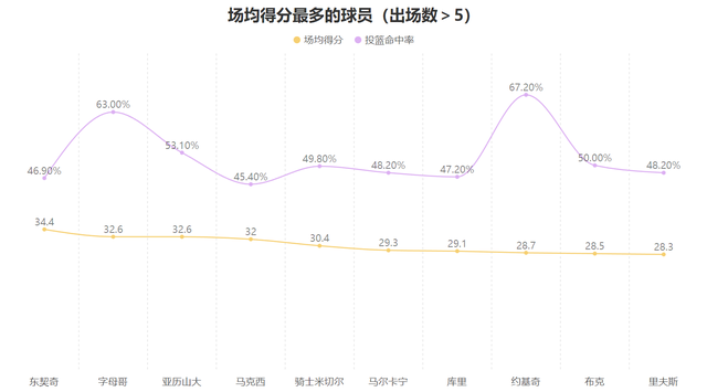 本赛季东契奇的场均34.4分与里夫斯的场均28.3分分别位于湖人队内第一与第二,而在联盟出场超过5次的球员里,东契奇与里夫斯的场均得分则分别位于第一高与第十高,同时46.9%与48%的投篮命中率也属于合格水准,这意味着两人均同时具备得分产量与效率。