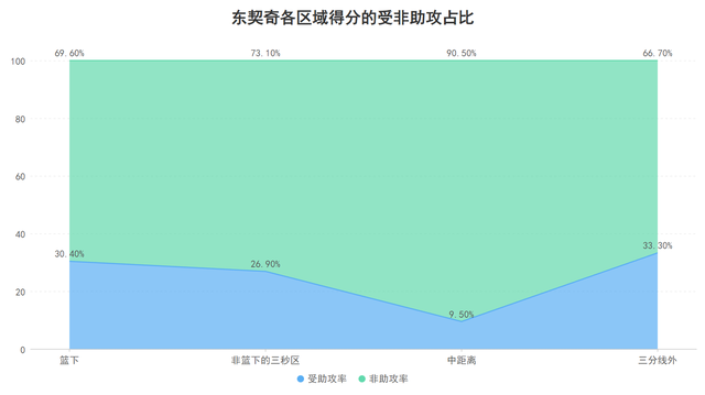 那么为什么这对持球大核类型的球员就能做到彼此兼容又正面作用巨大呢?东契奇各区域的得分受助攻率明显小于非助攻率,这意味着首先东契奇是一名明确的依赖自主持球单打创造得分的球员,他仅在篮下与三分线外有一定的接队友助攻完成得分;
