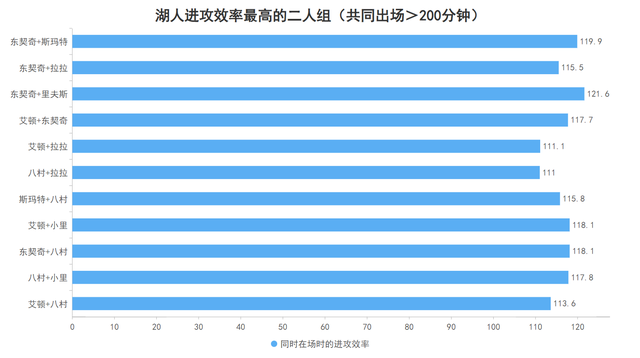 众所周知持球大核需要有球在手才能更好发挥,由于篮球只有一个所以持球大核之间本身很难兼容,因此当两名持球大核在场时效果通常不会很好,但东契奇与里夫斯这对组合却并非如此,此两人同时在场时湖人的进攻效率达到了121.6,这意味着两人同时在场时湖人每百回合可以得到121.6分,这个进攻效率在湖人队内出场时间超过200分钟的11对双人组里位于最高,也可以表明两人在场时就是湖人进攻最为高效的时刻。