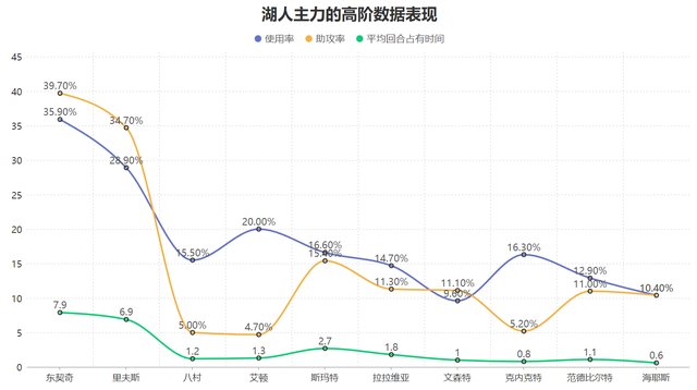 在得分表现稳定高效的同时东里二人组的助攻表现也极为优异,两人的场均助攻数分别为8.9与8.2分别位于联盟第六多与第八多,从高阶数据上来看,两人的使用率分别位于湖人队内第一与第二,同时两人的助攻率以及平均回合占有时间也位于队内第一第二,这意味着两人消耗了湖人最多的出手机会并且队友的得分来源也集中在这两人,可以说现在的湖人是两名持球大核共同梳理进攻的。